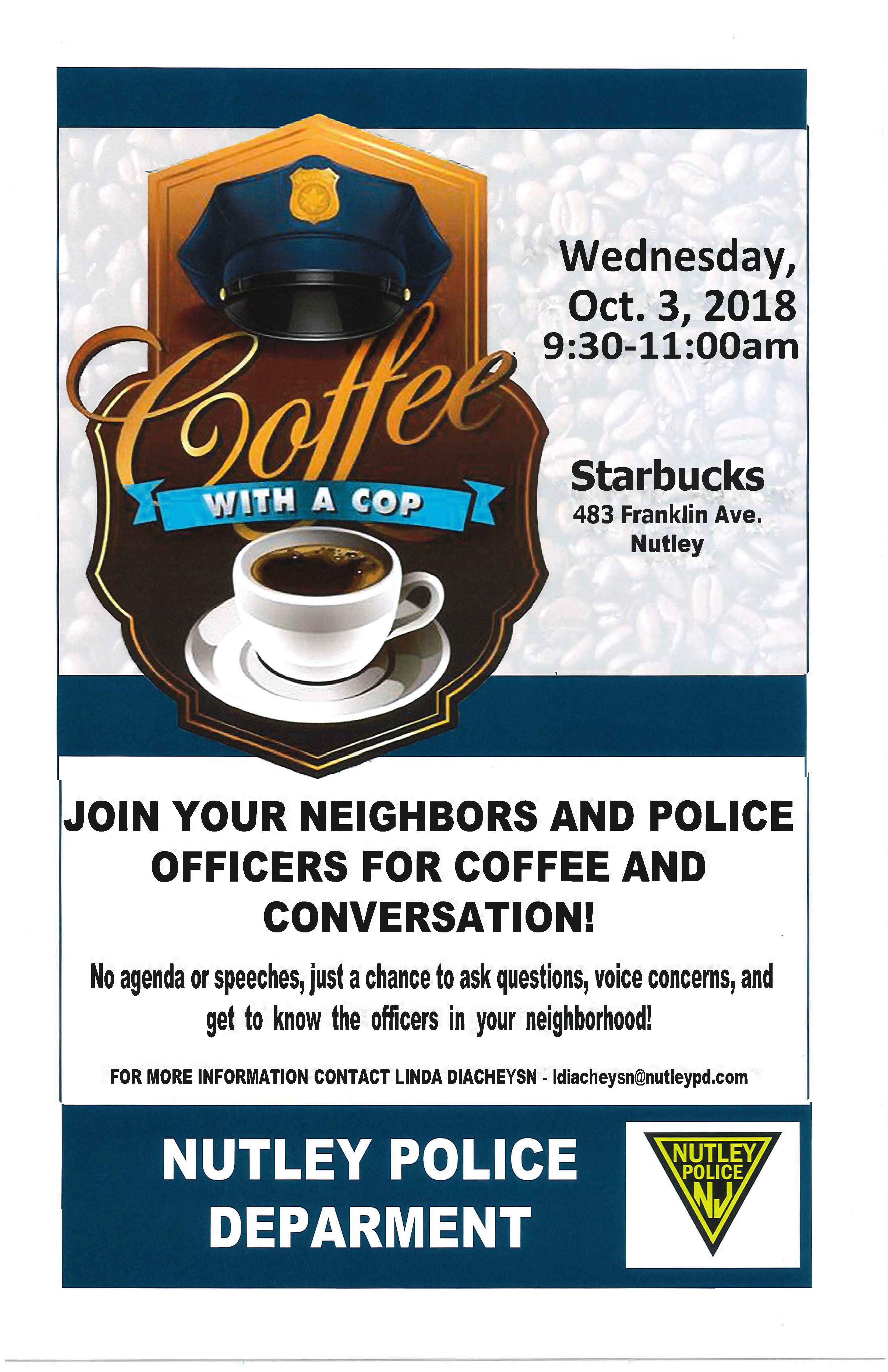 All community members are invited to attend. The event begins at 9:30 am at Starbucks located at 483 Franklin Avenue in Nutley. Please contact the Nutley Police Department if you have any questions at 973-284-4940 x4947.
