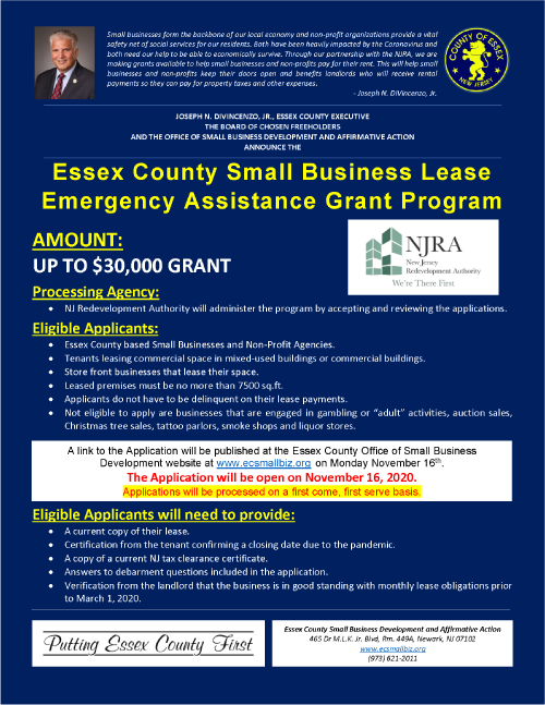 Essex County, NJ – Essex County Executive Joseph N. DiVincenzo, Jr. announced that Essex County is allocating $9 million to create the Essex County Small Business Lease Emergency Assistance Grant. This grant funding is designed to help small businesses and non-profit agencies in Essex County that have been negatively impacted by the Coronavirus pay their rent. Essex County businesses and non-profit agencies would be able to apply for as much as a $30,000 grant. Essex County is partnering with the NJ Redevelopment Authority to administer the program. Applications will be available beginning Monday, November 16th at the Essex County Office of Small Business Development website at www.ecsmallbiz.org. Grants will be awarded on a first-come, first-served basis.