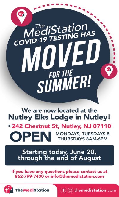 Commissioner Mauro G. Tucci and the Department of Parks and Recreation announce The MediStation Covid-19 Testing has been re-located for the summer. The new location is the Nutley Elks Lodge, located at 242 Chestnut Street.