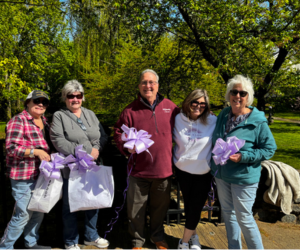 On Friday, April 26, Greater Nutley Cancer Foundation trustees Linda Hamilton and Janet Halchak were joined by Commissioner Mauro G. Tucci, members of the Nutley Parks and Recreation Department and others at Memorial Park (the Mud Hole) to present 200 purple colored “Bows for Cancer” to Rally 4 Hope team members. These bows will be displayed around town to show support and call attention to the May 10 event.